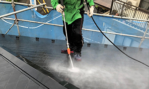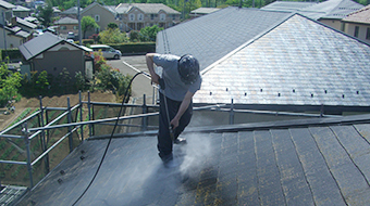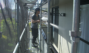 高圧洗浄での水洗いによりほこりなどの汚れを落とし、きれいな状態にします。丁寧にしっかり洗浄することで、塗料の仕上がりが良くなります。